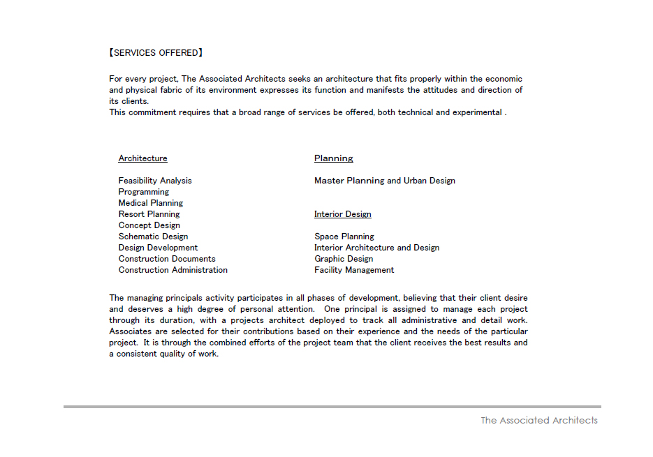 日本をベース基地に、環太平洋地帯を中心とした都市開発 プロジェクト、ホテル、美術館、集合住宅を専門業務に、国際的な 専門建築をチーム編成したユニークな活動を行う。